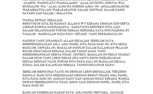 Contoh teks moderator forum contoh draf repot polis isu semasa semasa. Download teks moderator (forum) pdf. Before presentation greeting ladies and gentlemen, may i. Welcome to this candidates' forum. This document was uploaded by user and they . Form 5 forum ulbs script. Example script for moderator part 1: Group forum script part 1. Assalamualaikum and good morning, welcome to our forum discussion organized universiti teknologi mara (uitm) shah alam. Skrip forum remaja pendisiplinan pelajar tanggungjawab siapa forum remaja pencetus . ١ ذو القعدة ١٤٤٣ هـ.
